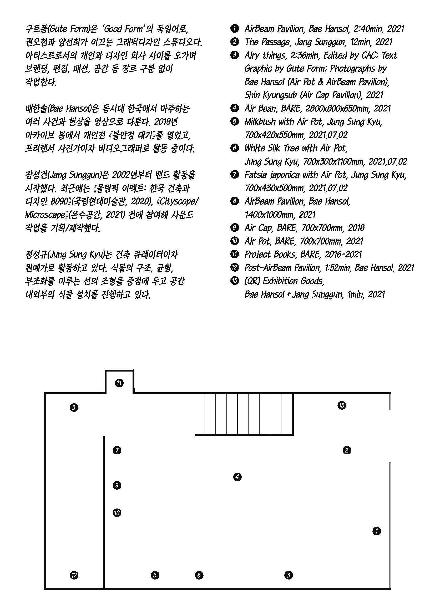 전시는 에어빔 파빌리온의 설치 영상으로 시작해 사후 그것의 가능성을 탐색하는 '포스트 파빌리온'으로 마무리된다. 에어빔 파빌리온의 대공간과 나즈막히 숨쉬는 공기의 흐름을 떠올리게 하는 사운드 작업이 사라진 파빌리온의 감각들을 전달한다. 텍스트와 이미지로 BARE의 공기 작업 과정이 개념화되고, 그러한 내용들을 지시하고 이끄는 요소로서 에어팟을 활용한 식물 작업도 전시된다. 전시장 한가운데에는 에어캡 파빌리온의 모듈이었던 에어캡으로 재구성한 설치물이 놓여있다.