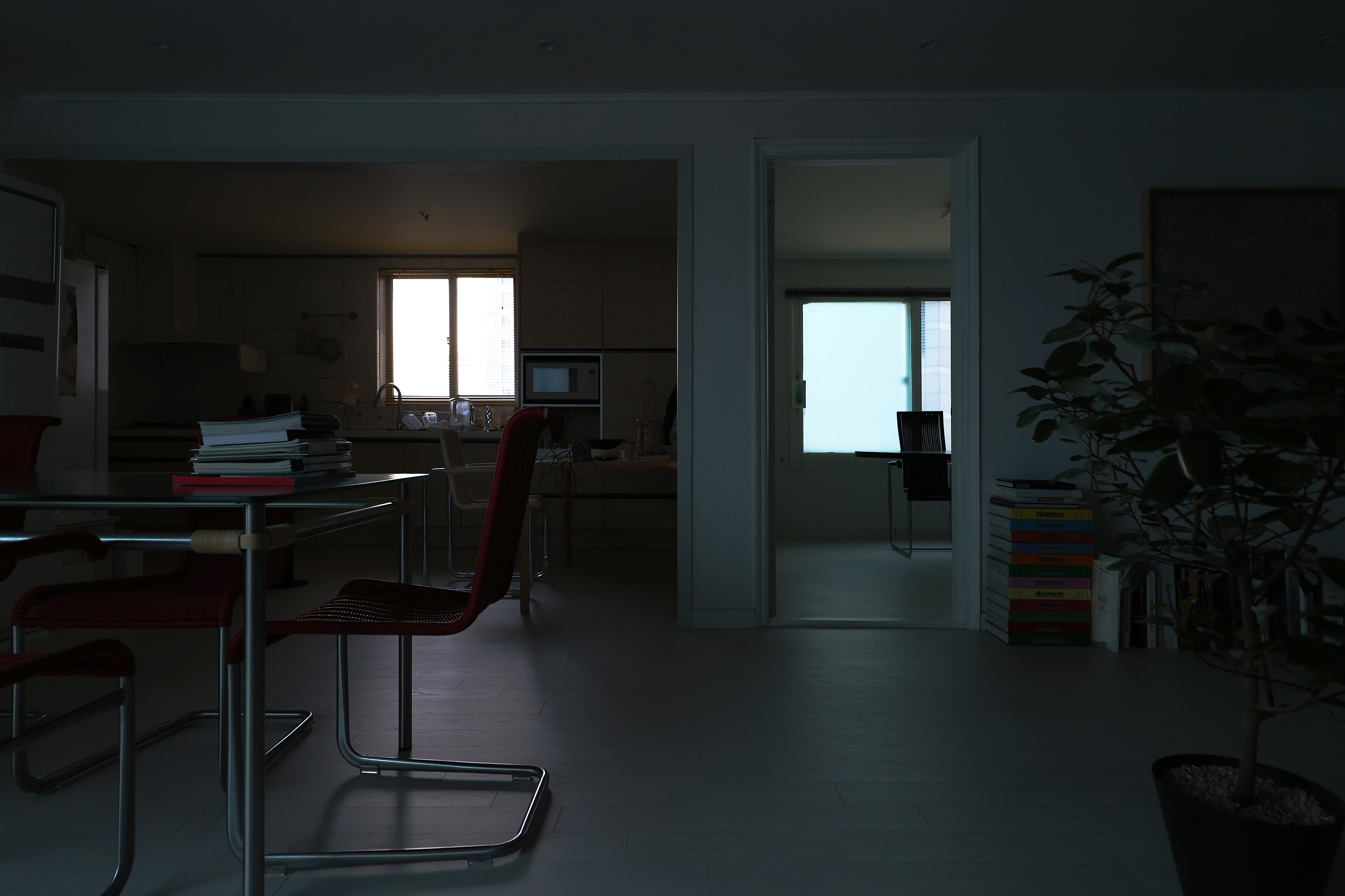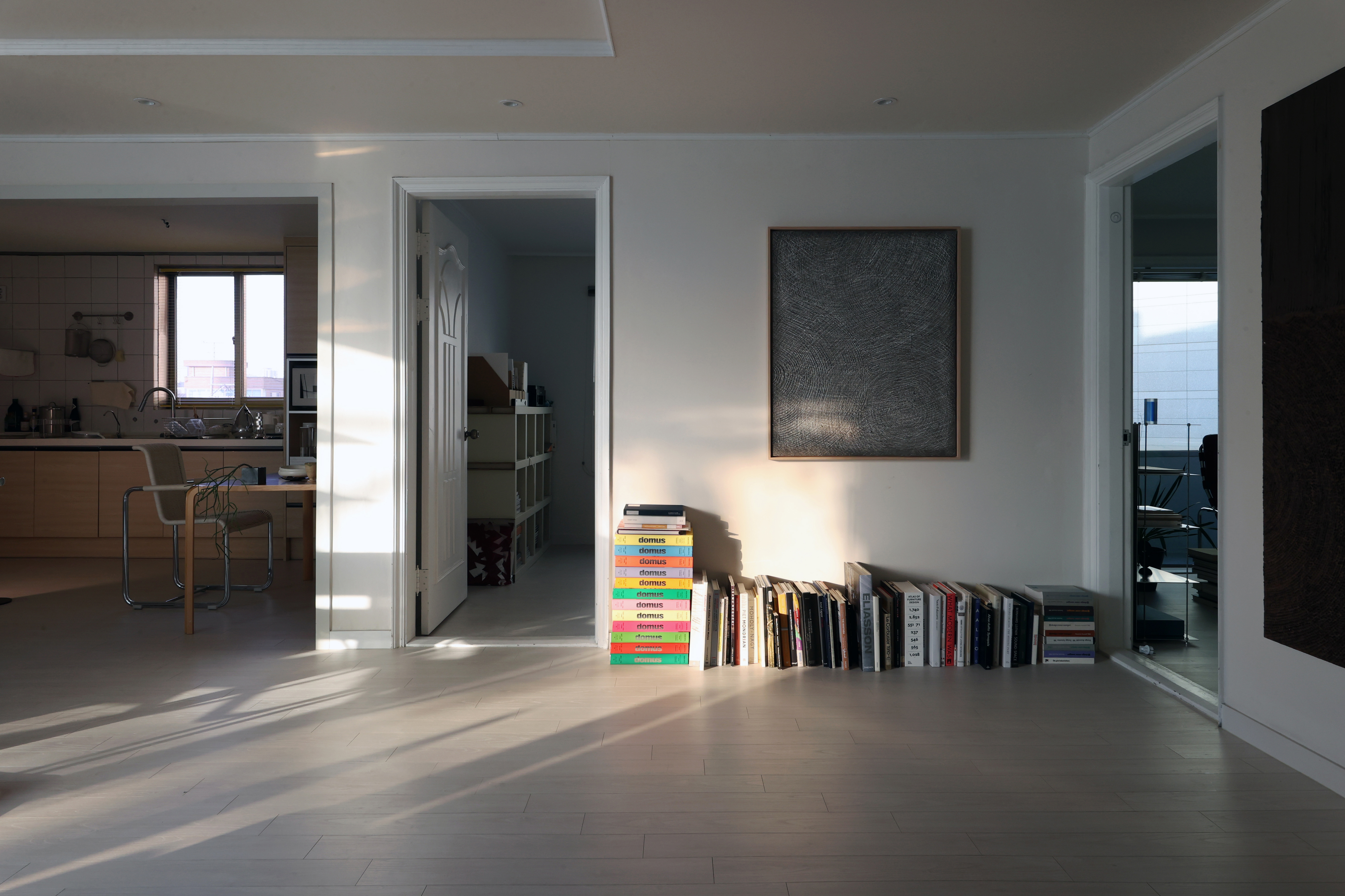 컬렉터의 생활공간이자 집무실로 사용하는 이 공간은 90년대 지어진 빌라로 4LDK의 구조를 가진다. 1인 가구가 생활하기에 넓은 공간일 수도 있으나 작가의 작품을 소장할 수장고와 사무실 그리고 생활 공간을 배치하기에 크지 않았다. 벽을 허무는 큰 공사보다는 기존의 공간 구획을 따라가되 신체가 제일 먼저 닿는 바닥과 조명만 손을 보았다. 문이라는 장치를 통해 영역과 출입 여부를 구분 지었으며 누구든 드나들 수 있는 곳은 문을 떼어냈다. 가구, 책, 사물, 조명 그리고 창을 주요 요소로 설정하여 공간의 외형적 구축보다 내부적 구축의 관계를 만들고 작가의 작품을 배치하여 관계의 긴장감과 대립을 부여했다. 컨텐츠를 새로 만들거나 공간을 디자인하는 역할이 아닌 현재까지 축적된 것들을 정리하고 재배치하는 데 집중했다.
